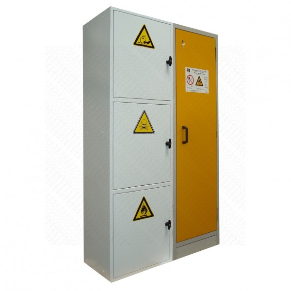 Découvrez notre armoire anti feu Multirisques 4P/T30 de dimensions H1950 x L1180 x P600 mm et équipée d'un bac de rétention de 23 litres. Elle est conforme à la norme française NF EN 14470-1 et convient au stockage multirisque des produits dangereux : produits inflammables, toxiques, nocifs, corrosifs, acides et bases. Construite en stratifié haute pression HPL, notre armoire anti-feu assure une résistance au feu de 30 minutes et garantit un haut niveau de sécurité, notamment grâce à son système de fermeture automatique des portes par thermofusible ≤ 50°C. Notre armoire anti-feu multirisques est garantie 2 ans.